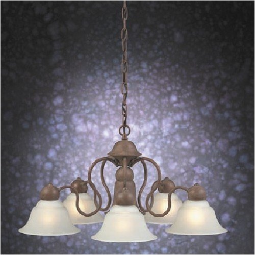 Enjoy premium quality lighting products at steeply discounted prices. 6 light chandelier (5 Light + downlight) in Olde Brick finish with etched glass shades.26.5'' W x 12 1/2'' H. Uses 5-60 watt medium base bulbs and 1-50 watt reflective bulb (G25 & R20) (not included