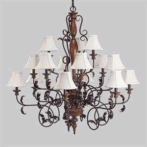 This traditional 15-light chandelier features a distressed cherry wood column and bobeches, Ecru textured linen shades and overlapping scrolls with delicate leaves in an Autumn Haze finish