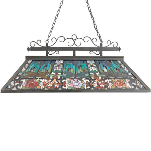 Design Style: European Product Category: Island Light Room(s): Billiards Room; Kitchen Finish: Vintage Bronze Dimensions: 20" H, 48" L, 16" W Item Weight: 38 Item #: TFDG348VB Iron Material (3)100W G40 Medium BaseGlass Count: 1306 Lacy filigree-winged dragonflies flutter among multicolored roses, providing an exquisite depiction of a luscious summer garden. This look is inspired by the original dragonfly designs of Louis Comfort Tiffany. Each shade is handcrafted from genuine Tiffany art glass, and the highly decorative base and body are finished in a vintage bronze patina. See the coordinating Products for Quoizel LightingsTFDG348VB