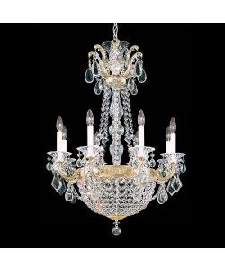 Ten Light Chandelier from the La Scala Empire CollectionThis rendition of La Scala exhibits a variety of design motifs, all of them tending to magnificence. Empire styling is evident in the crystal basket densely woven of chains of octagons. Baroque influences are apparent in the ornate cast arms and scrolls. Handcut crystal pendants and gems in classic shapes bedazzle the eye.Ten light up / down lighting chandelierAvailable with Handcut, Swarovski Spectra, Optic Handcut or Golden Teak crystal optionsRequires 10 60w Candelabra base bulbs (not included)Supplied with 40" of chain and 152" of wire