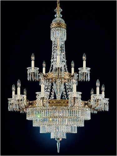 Twenty Light Two Tier Chandelier from the Romanoff CollectionIt s easy to picture the Czarist court intriguing under this exotic crystal chandelier. Stylistic influences are apparent from Byzantium, St. Petersburg, ancient Egypt and early Rome. Romanoff is unabashedly opulent, with mouth-blown handcut crystal column elements and a variety of dramatic crystal shapes. A two-tone finish emphasizes the richly patterned gallery. Romanoff was among the Schonbek crystal chandeliers chosen to light a prestigious 2005 exhibit at The Newark Museum, "At Home with the Last Tsar and His Family."Fifteen light up lighting two tier chandelierFeaturing Heritage Handcut crystalsRequires 20 60w Candelabra base bulbs (not included)Supplied with 126" of chain and 211" of wire