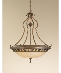 This glamorous pendant chandelier design features classic detailing for an elegant, formal look. The Barnard lighting collection comes in a Firenze gold finish. The bowl glows with beautiful amber alabaster glass. A fabulous accent for living and dining spaces. Firenze gold finish. Amber alabaster glass. Takes five 100 watt bulbs (not included). 29" wide. 35" high. Canopy is 6" wide. Includes 5 feet of chain, 15 feet of wire.