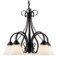 White glass shades. Uses five medium base E26 bulbs, 60 watt maximum, (sold separately). 17-3/4" height x 21" width.