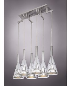 Illuminate your home with this thoroughly modern 6-light pendant chandelier. From George Kovacs, this piece features an exquisite cluster of six pendants. Each features a clear glass outer, while the canopy and inner frames come in a lustrous brushed nickel finish. An wonderful, contemporary look for the home. Brushed nickel finish. Clear glass. Includes six 60 watt candelabra bulbs. 17 1/2" high. 29 1/2" wide. 15" deep. 96" max hang height.