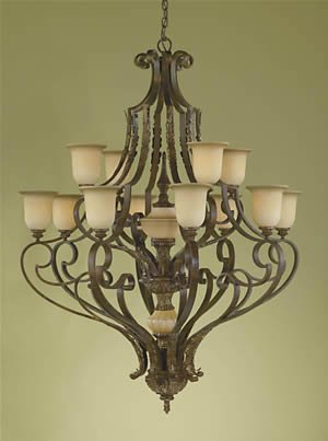 Manufacturer: Murray Feiss Lighting. Part Number: F2007/8 + 4ATS. Product Type: Chandelier. Product Collection: Coventry Castle. Finish: Aged Tortoise Shell. Shade: Speckled Champagne Glass Shade. Dimensions: Height 57" Diameter 46". Canopy: 7" Round. Bulbs: (12) Edison Base 75 Watt (1) Candelabra Base 25 Watt. Weight: 77.68 Lbs. UL Listed. .