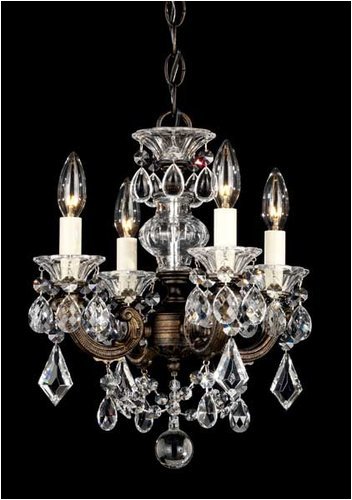 Four Light Mini Chandelier from the La Scala CollectionLa Scala in any size is operatic. As a mini chandelier its charisma is on a very personal scale. Assuming you put this mini chandelier in a small space, you ll be able to examine it closely. And you ll be richly rewarded. There s lots of wonderful detail to enjoy in the ornate cast arms. The crystal pendants are handcut in a variety of classic shapes, which makes for an excellent display of prismatic effects.Four light up lighting mini chandelierAvailable with Handcut, Optic Handcut, Swarovski Spectra, or Teak crystal optionsRequires 4 60w Candelabra base bulbs not included)
