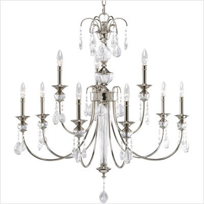 Nine-light two-tiered chandelier with faceted clear crystal center column and bobeche. Double tiered clear crystal drops with teardrop element creates a cascading waterfall effect. Thomasville Lighting Collection.