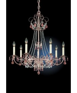 Seven Light Chandelier from the Adagio CollectionThis crystal chandelier is very vintage, and very European, with amber and amethyst colored crystal fruit. The harmonious shape of Adagio evokes past centuries when gracefully-bejeweled women were great patrons of art and music. Leaf ornaments are Florentine-inspired. The shades, which are optional, intensify the femininity of the design.Seven light up lighting chandelierAvailable in a variety of finishes and crystal optionsRequires7 60w Candelabra base bulbs (not included)Supplied with 40" of chain and 152" of wire