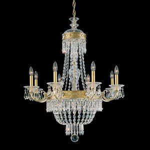 Ten Light Chandelier from the Romanoff CollectionIt s easy to picture the Czarist court intriguing under this exotic crystal chandelier. Stylistic influences are apparent from Byzantium, St. Petersburg, ancient Egypt and early Rome. Romanoff is unabashedly opulent, with mouth-blown handcut crystal column elements and a variety of dramatic crystal shapes. A two-tone finish emphasizes the richly patterned gallery. Romanoff was among the Schonbek crystal chandeliers chosen to light a prestigious 2005 exhibit at The Newark Museum, "At Home with the Last Tsar and His Family."Ten light up / down lighting chandelierFeaturing Heritage Handcut crystalsRequires 10 60w Candelabra base bulbs (not included)Supplied with 40" of chain and 152" of wire