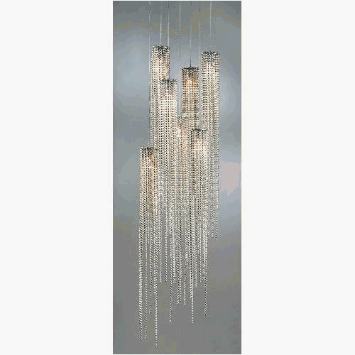 The lovely cylinder shapes are created by concentric nickel beads. Slinky and touchable, the beaded shades of this ceiling light creates intriguing light output and shadow patterns. This wonderful creation is elegant and modern. This light fixture adds instant glamour and sophistication to an interior. Brushed nickel finish aluminum beads. Includes seven 35 watt MR-16 Halogen bulbs. 10" wide. 36" high. Each beaded shade is 3" wide, 3" deep, 20" high. With 10" diameter round canopy