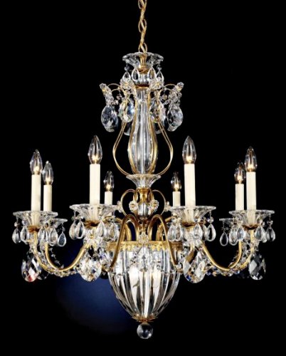 Layers of Heritage hand-cut crystal sparkle against the heirloom gold finished frame and details. With a lovely sense of balance, this chandelier is graceful while providing generous illumination. Takes eight 60 watt candelabra bulbs and two 60 watt candelabra bulbs for hidden bowl areas (not included). 26 1/2" high. 29" wide. Canopy is 5" wide. Includes 40" of chain, 120" of lead wire. Hang weight of 23 lbs.